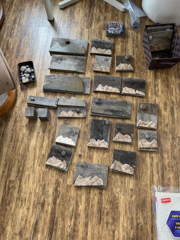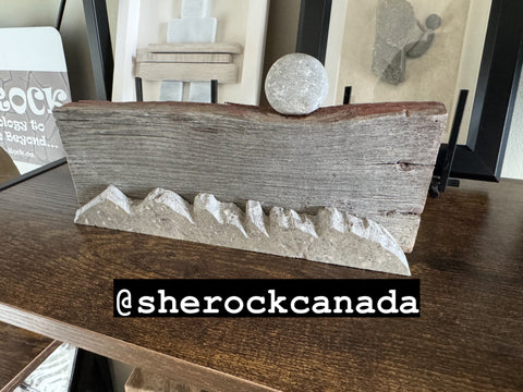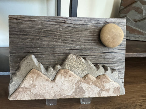 These are hand made with working the rock, sanding the rock and mounting it on repurposed fence barn boards. Often a Dolomite sun is used to show the Mountain Scape art. Wall mount or sit on a bookshelf.